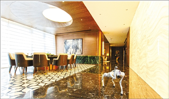 全屋智能的終極目標,是讓科技“活化”。項目與華為合作的PLC電力載波系統,解決了Wi-Fi斷聯(lián)的痛點(diǎn)。業(yè)主王女士演示道:“哪怕斷網(wǎng),燈光和空調仍能通過(guò)電路信號控制?!倍悄軑u臺藏著(zhù)家的“空間魔術(shù)”——只需一鍵觸發(fā),電動(dòng)驅動(dòng)的臺面便循著(zhù)預設軌跡平穩舒展,藏于底部的隱形滑軌帶著(zhù)細膩阻尼緩緩延伸,30秒內原本2.6米的吧臺瞬間拓至3.1米開(kāi)闊臺面,露出隱藏于下層臺面的水槽,升降龍頭緩緩升起。這不止是物理空間的延展,更是生活場(chǎng)景的“無(wú)縫跳轉”:從吧臺到西廚的蝶變,藏著(zhù)對每一種生活節奏的精準適配。